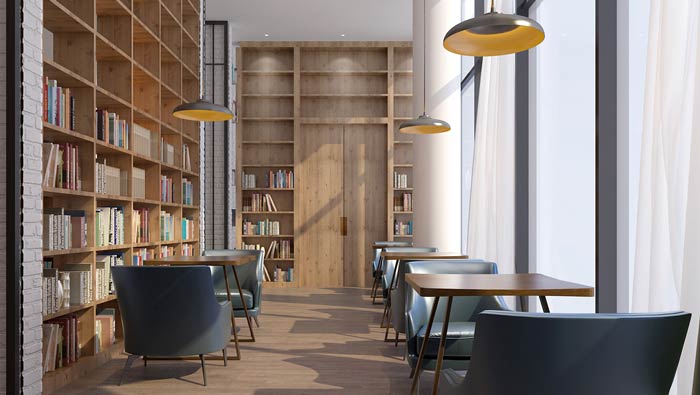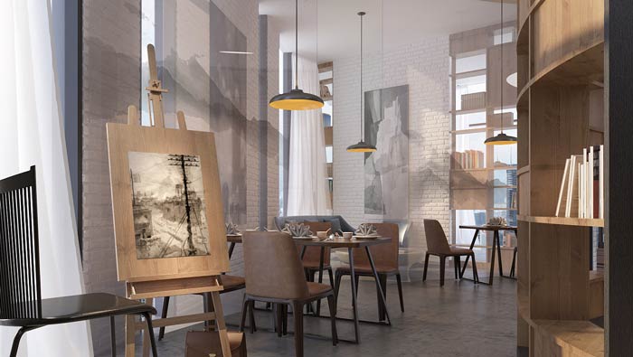 咖啡廳過道裝修設計:過道在這里不僅起到連接的作用,同時設計師也賦予了其接待、休息的屬性,桌椅擺放在過道的外緣,以此滿足客戶在空間中的休息與閱讀。
