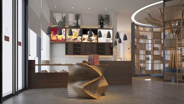 咖啡廳前臺裝修設計:異形吧臺、展示柜、展示牌、燈飾構成整個前臺空間,客戶進入后在這里可以選擇自己喜歡的飲料,在展示柜可以挑選自己喜歡的甜食,簡單、明了是第一原則。