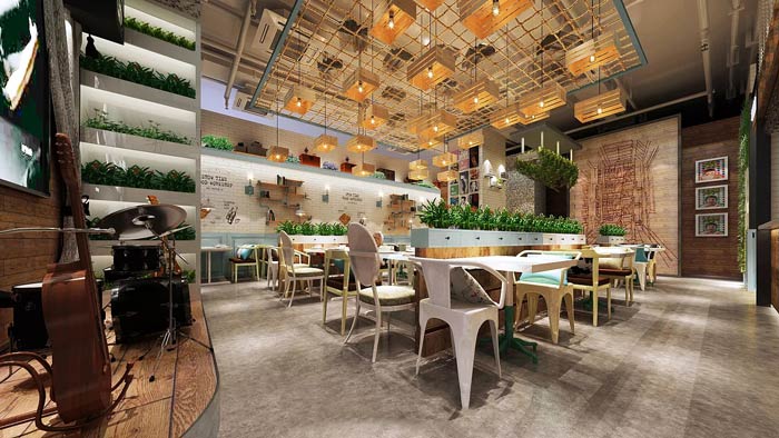 烤魚燒烤店裝飾設計:綠植為空間帶來綠色與自然,音樂為空間帶來旋律與活力,柔和的燈光為空間營造了浪漫的氛圍,整個相互交互在一切,營造一個優質的就餐環境。