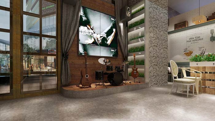 烤魚燒烤店音樂區設計:在進入室內的那一瞬間,優美的音樂在客戶的耳邊響起,這不是音響中的音樂,而是真人動聽的音樂,這里提供聽歌與點歌,目的就是營造浪漫的就餐氛圍。