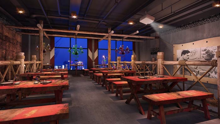燒烤店一樓餐區(qū)設(shè)計:此處給人的第一感覺好似是一個原始部落,客戶在這里就餐會感受到不一樣的氛圍,安靜的空間氛圍,仿佛時間都慢了下來,讓客戶靜靜的享受美食。