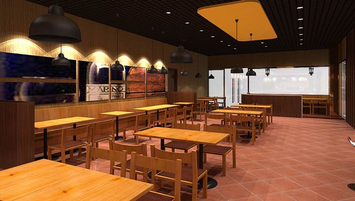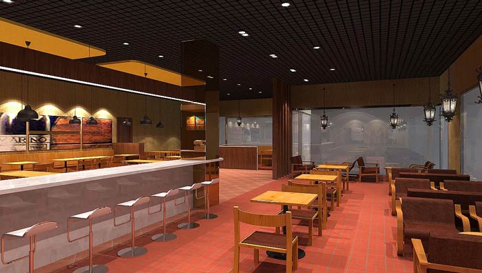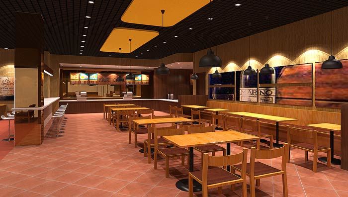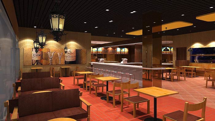 快餐店餐區(qū)裝修設(shè)計(jì):暖色系的燈光、暖色系的色彩設(shè)計(jì),給客戶一個(gè)穩(wěn)定的就餐環(huán)境,這里沒有用桔紅色,是希望給客戶一個(gè)安定的環(huán)境,業(yè)主不希望因?yàn)樯实拇碳ぃ斐煽蛻舫钥焓场?/span>