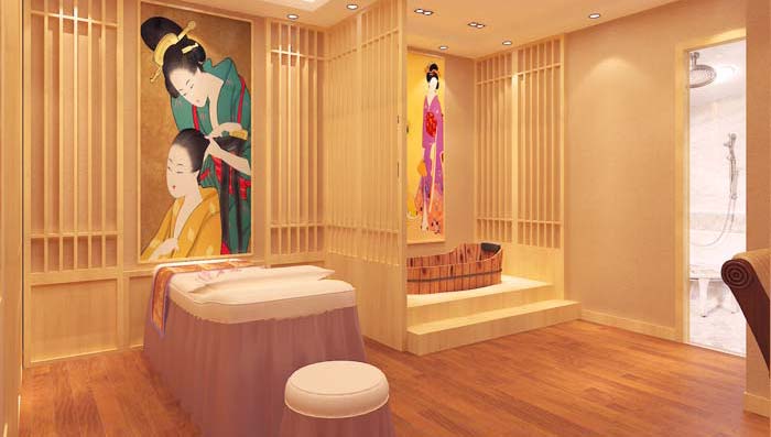 日式的SPA間,我們用了日式注明的細竹條做的花格,進行紋樣的拼接,并且在花格上做了日式的浮世繪的刺繡。