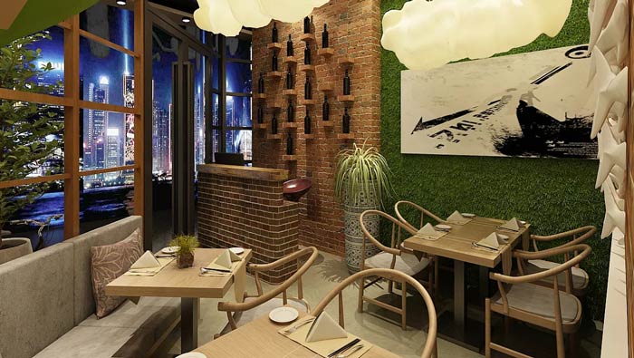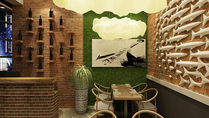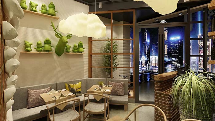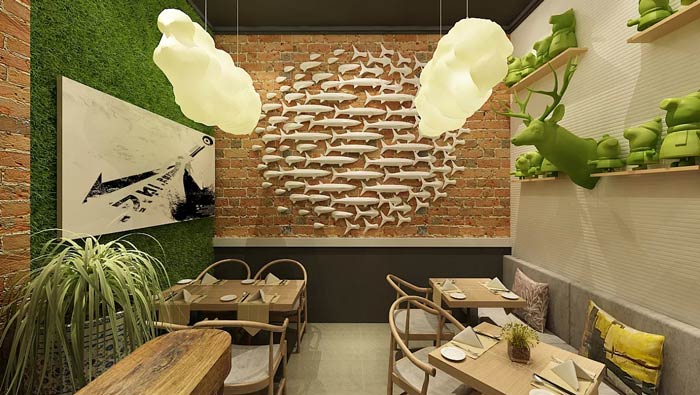 特色面館餐區裝修設計:這里有魚兒、鹿等動物,有綠植、綠色植物墻等植物,還有云狀的燈光,三者相連構成一個動靜結合的空間,在這里整個空間宛若自成一體。
