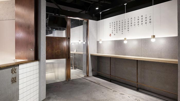 牛蛙面館餐位裝修設計:對著墻壁吃面不免局促孤單,而這正是店主與設計師想傳達的理念“專心吃好一碗面”,對著水泥墻面,吊著一盞溫暖小燈,將注意力集中在食物上。