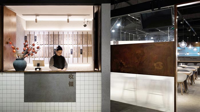 牛蛙面館入口裝修設計:設計師將面館入口處,布置成為收銀臺和等候區,設計師為了保證空間的通透,與就餐不被打擾,故此采用三種不同透明度的材料,打造一個與眾不同的門。