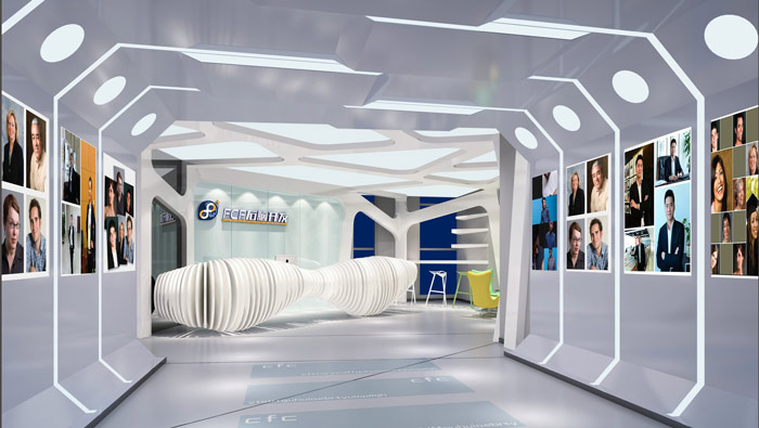 教育機構前臺設計:當客戶進入空間之前,首先看到的就是企業的師資力量,同時銀白色的設計主調,也讓人們對內部空間產生期待,進入此處仿佛到了科技的最前沿,設計師希望讓客戶感受到企業的實力與信心。
