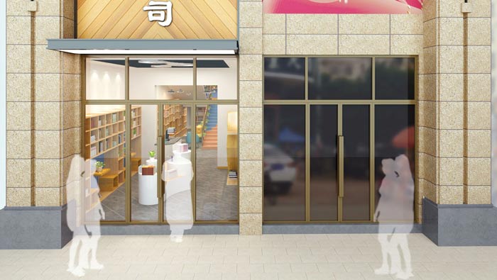 舞蹈培訓機構門頭設計:巨大的門頭吸引過路人的注意,透明的玻璃門讓人對室內的一切一覽無遺,室內的一切都讓人感到好奇,對于小孩子更是有著巨大的吸引,在好奇之心的驅動之下走進室內。