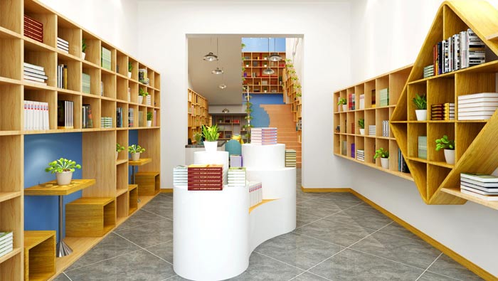 舞蹈培訓機構一樓前廳設計:一樓前廳主要是圖書銷售、購買與閱讀,在這里有著各式各樣的書籍,孩子們可以在這里閱讀,柜子的設計,打破傳統的中規中矩,柜子中藏著休息區域,讓空間更有體驗感。
