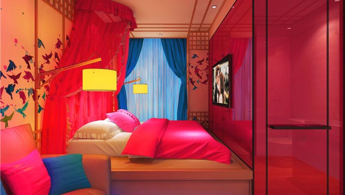 Hello Kitty客房的設(shè)計(jì):此處給大家?guī)淼膱?chǎng)景就是一個(gè)少女的心,設(shè)計(jì)師希望在這里,讓女孩子想起自己少女年代的美好畫面,讓男孩子可以走進(jìn)女孩子的心中,讓雙方彼此的感情更進(jìn)一步,在這里彼此的感情會(huì)經(jīng)過不斷的發(fā)酵,進(jìn)入一個(gè)新的階段。