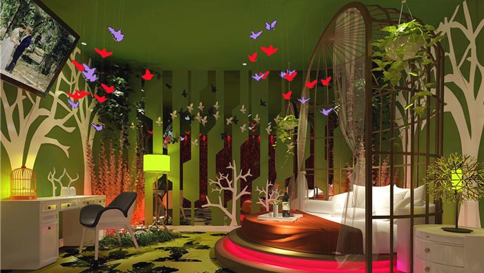 盛夏野趣客房的設(shè)計(jì):童話世界是每一個(gè)童年的夢(mèng)想,在童話中有白馬王子、小精靈、魔術(shù)、巫師等等一切,設(shè)計(jì)師希望為戀人們提供一個(gè)童話世界,讓他們?cè)谶@里去感悟其中的酸甜苦辣,讓彼此化身為童話的身影,去經(jīng)歷童話中的一切,讓情感得到一次質(zhì)的升華。