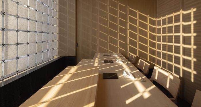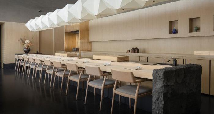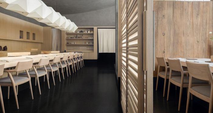 設(shè)計師將味覺上的奇妙感受用空間的方式敘述,利用原生材料和光線的結(jié)合,打造出淳樸的物性和真摯的情感。空間氛圍以質(zhì)而實綺、癯而實腴的風(fēng)格為主,靈感來源于日本的傳統(tǒng)藝術(shù)和自然景觀。