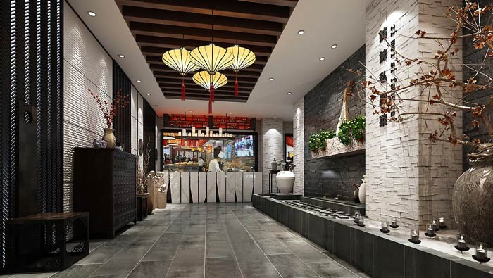 私房菜館過道設(shè)計(jì):中式的門窗、板凳、吊頂、走廊裝飾,讓客戶仿佛置身于古代的客棧之中,這樣的空間相信很多人只是在電視劇上看到過,設(shè)計(jì)師希望客戶在這里看到實(shí)物。