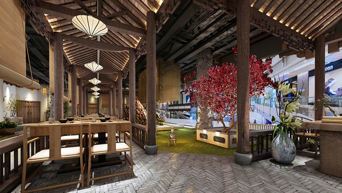 特色私房菜館花園設計:亭臺樓閣中的花園是空間中的一大亮色,這里自然的氣息非常濃郁,這里也是空間的中心區域,其他區域圍繞著花園,讓整個餐館空間充滿綠色。