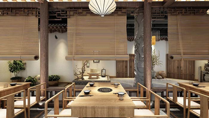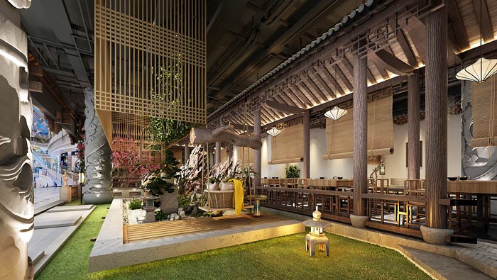 特色私房菜館庭院設計:庭院是空間給人的第一感覺,這也是設計師希望看到的,從整體看整個空間,無一不展現著中式的魅力,設計師希望打造一個區別于現在的設計。