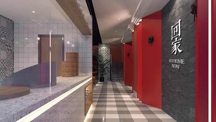 私房菜餐廳進門過道設計:此處是客戶進入餐廳的必經之道,回家兩個字預示著餐廳的服務宗旨,透明的廚房讓客戶,可以清楚的看到整個廚房的一舉一動,讓客戶吃的放心、安心。