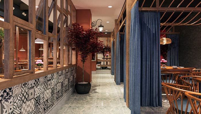 私房菜餐廳布藝窗簾設計:布藝窗簾做為空間的隔斷來使用,既可以起到阻隔的作用,同時也簡單、便捷,拉上形成一個獨立的就餐空間,拉開整個空間融為一體,即便捷又方便。