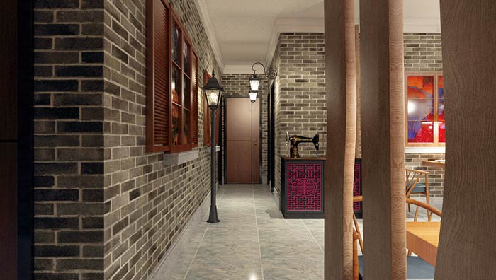 私房菜餐廳餐區設計:老式的磚墻空間,會有一種親切的感覺油然而生,在這樣的空間中吃飯,會讓很多客戶想起媽媽的手藝,在這里美味、回憶、回憶中的味道,在這里交織。