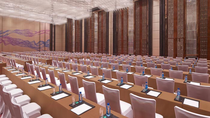 大型會議室的設計:設計師在設計的時候,了解到酒店本身就與很多大型企業有往來,故此設計師在于客戶交流之中,打造了此處大型的會議室,設計師的目的就是將會議室酒店融入空間之中,讓酒店功能更加齊全,同時會議結束之后,休息也是常態,這是一種新型的連鎖模式。