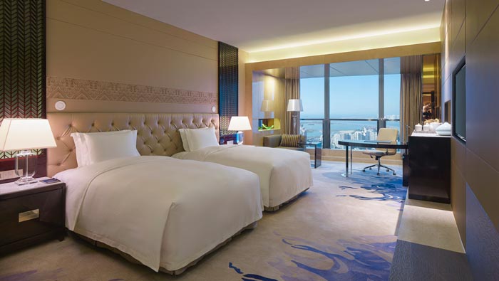 雙人間的設計:此次的落地窗是一大亮點,當顧客進入空間之后,相信也是很累了,設計師要做的就是讓顧客可以在這里得到暫時的緩解,此時落地窗發揮了作用,顧客坐在窗邊,欣賞著外面的車水那龍,欣賞著外面逐漸變小的建筑與人,讓自己的心平靜下來。