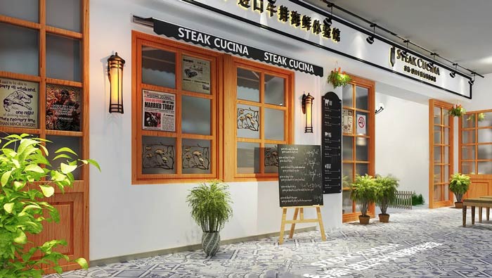 西餐廳外立面裝修設計:這里給人一種世外桃源的感覺,整個空間十分潔凈,讓人十分享受這樣的環境,進口牛排海鮮體驗館,為客戶講解著餐廳的主營餐品,簡潔明了。