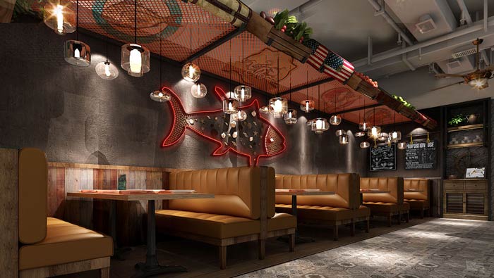 西餐廳海鮮餐區裝修設計:墻上似乎有一條魚兒在搖曳,清楚明白的告訴客戶這里屬于海鮮餐區,不同的食品配以不同的就餐環境,就是希望客戶可以身臨其境的,感受與之搭配的餐區設計。
