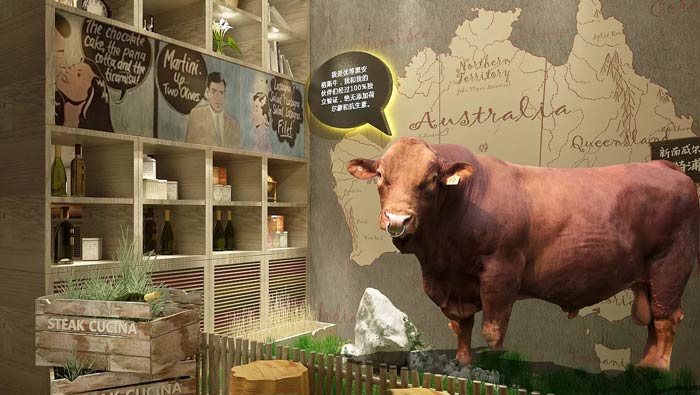 西餐廳墻畫裝修設計:優等黑安格斯牛,背后的地圖樣式告訴客戶,它們來自于何方,青草、無污染的環境,告訴客戶它們都是天生地養,沒有經過任何人工的培育。