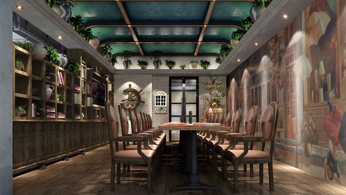 西餐廳前臺裝修設計:工業風、田園風在這里得到很好的融合,讓客戶進入空間,首先感受到的是自然氣息,自然氣息讓客戶焦躁的心靈得到有效的緩解,讓客戶吃的安心、吃的放心。