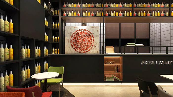 主題西餐廳進門區裝修設計:進門左側是吧臺,這是展示著各式各樣的披薩,將披薩放在空間的進門區域,是希望讓客戶在進門的第一瞬間,就被餐廳的美食所吸引。