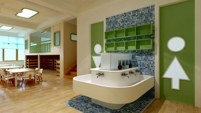 洗手區域的設計:此處通往的是就餐區,在洗手池的設計上,設計師對地面、洗手池都做了處理,目的就是為了避免因為水造成的地面濕滑,兩個門一個進一個出,設計是希望可以從小培養孩子排隊的意識,一進一出之間也見證了教育的重要性。