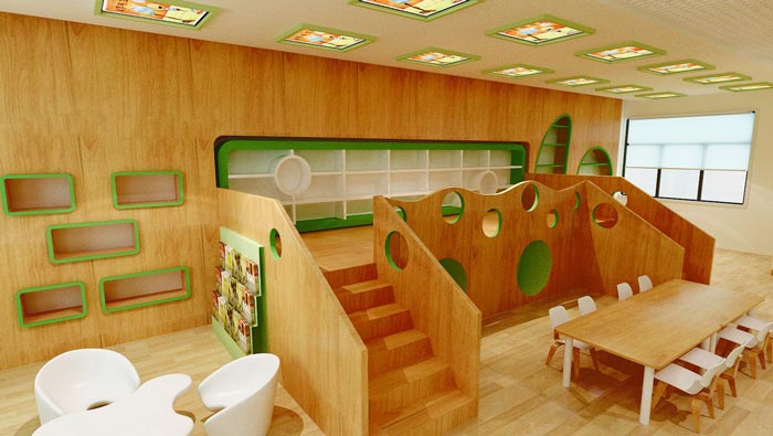 娛樂區域的設計:此處與就餐區域融合在一起,當就餐結束20分鐘以后,孩子們可以在這里盡情的玩耍,玩耍是孩子的天性,設計師希望可以將其進一步的延伸,讓孩子在玩耍中不斷地成長,當玩耍累了之后,孩子們可以坐在一起看看漫畫、圖書,課外生活也是一樣的精彩。
