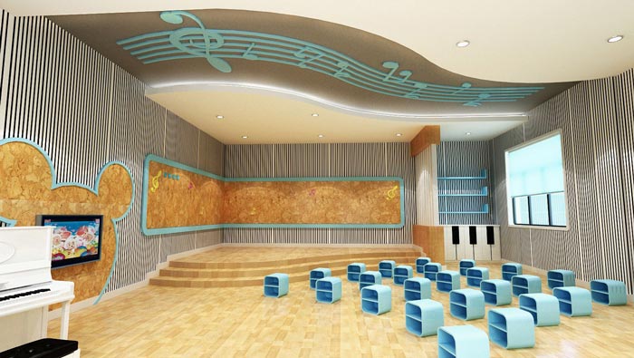 音樂教室的設計:這里大致可以容納下30多個小朋友,也就是大概一個班多一點點,能歌善舞是每個家長對于孩子的特殊期望,對于孩子本身來說也是一個不可不得的技能,在設計師看來若是引導得當,讓孩子喜歡唱歌、跳舞也不失為一件功德無量的事情。