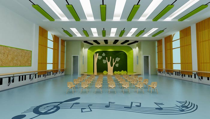 表演區域的設計:這樣也就是最后一個音樂教室,但是這個教室與上兩個稍有不同,不同的就是屬性的改變,在此次設計師希望在滿足音樂教室的同時,也可以滿足表演的需求,設計師希望每一個孩子都是一個表演家,在臺上可以盡情的表演,培養每一個孩子表演、演講的能力。