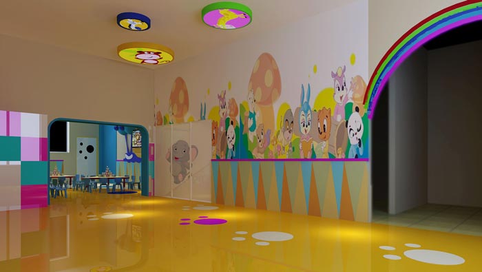 大廳的設計:此處位于內部空間的轉接口,這里最大的特點就是四通八達,此處連接了空間的每一個區域,設計師要做的就是保證空間的暢通,地面動畫的腳印、墻面動畫中的各種形象、色彩的多樣化,無一不在吸引著孩子的注意力,設計師希望孩子在空間中是快樂的、開心的。