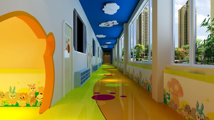走廊的設計:當從前臺進入室內空間之后,一條主動線將其引入室內,此處設計師采用了色彩、動畫等各種各樣的設計模式,目的就是讓孩子喜歡這里,同時設計師對于空間的采光要求也十分高,設計師希望讓孩子在快樂的同時,并時刻接觸自然,保證孩子快樂、健康的成長。