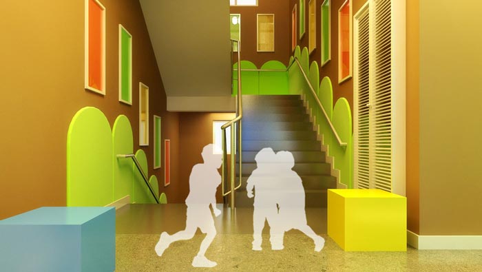 動線的設計:在設計師看來對于孩子來說,最喜歡的莫過于相互玩耍、相互嬉戲,故此設計師特意預留了足夠的活動空間,讓動線承載了這一特殊的屬性,設計師的想法就是讓動線既可以保證空間的暢通,同時也可以滿足孩子們在這里玩耍,設計師希望讓孩子們在學習的過程中可以玩的開心。