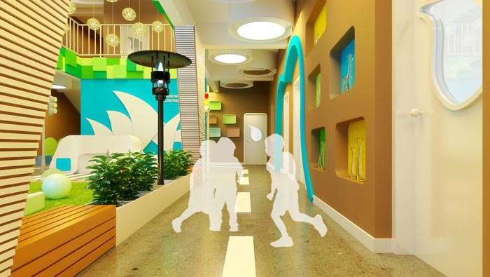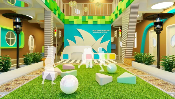 前臺的設計:當家長帶著孩子來到此地的時候,進入空間第一眼看到的就是綠油油的自然景觀,這是設計師繼承了戶外的設計特色,自然地向內延伸,讓人不會感到突兀,設計師的想法就是讓孩子進門就看到一個五顏六色的世界,滿足孩子濃重的好奇心,讓孩子一眼就喜歡上這里。