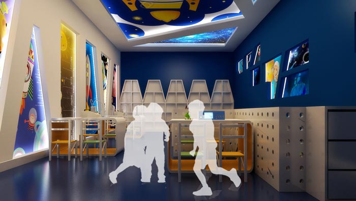 科幻教室的設計:在這里可以引發孩子們的聯想,相信大家在小時候都喜歡幻想,在設計師看來聯想與幻想就是搭配得當,對于人的成長十分有好處,故此設計師采用高科技打造一個立體式的科幻空間,讓孩子在這樣的空間中好奇心得以滿足,并以此為起點引發孩子對未來探索的興趣。