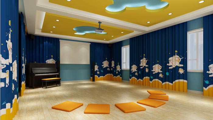 音樂教室的設計:對于每一個人來說,音樂都是美好的,對于孩子來說更是如此,當老師彈起鋼琴的時候,孩子們在后面翩翩起舞,無疑可以激發孩子們對于音樂的興趣,這里的一切都志在激發孩子的興趣,然后在興趣的指引下,達到教學的目的。