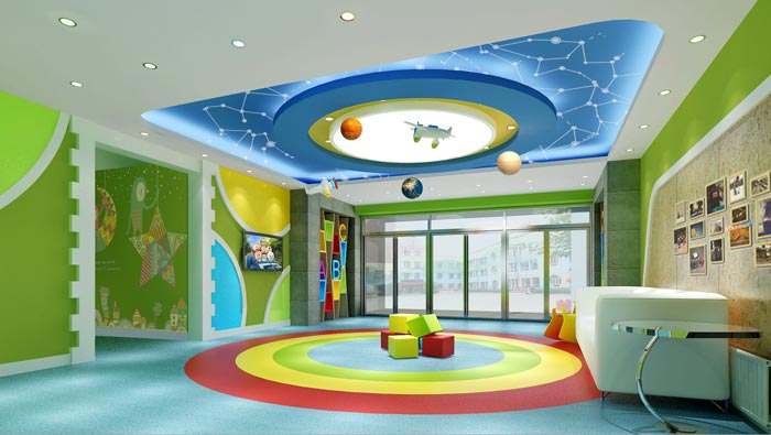 前臺大廳的設計:陽光透過大門射入室內,讓人感覺到溫馨與溫暖,設計師希望陽光可以無處不在,讓孩子在這樣的環境下可以健康、快樂的成長,在其中設計師采用了陽光、色彩之間的相互交融,設計師希望展現在孩子面前的是一個五顏六色的世界。