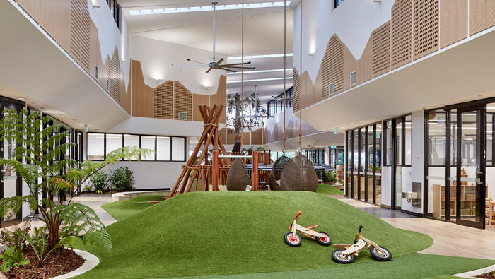 早教中心自然區設計:這里還原了很多自然屬性,孩子對于世界的認識是初步的,設計師希望讓孩子在這里逐步去了解自然,讓孩子通過自己不斷的發現,激發孩子的想象力。