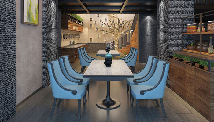 在餐廳設(shè)計(jì)中,設(shè)計(jì)師調(diào)用光、影以及配景、植物等表現(xiàn)手段來(lái)增強(qiáng)空間主題對(duì)人所產(chǎn)生的溫馨與浪漫。