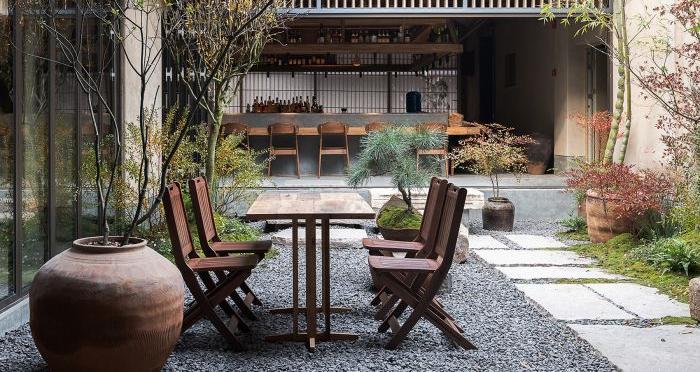 元古雲境是中國西南地區的首店,也是成都的第一家店。餐廳位于成都太古里的二樓和三樓,通過樓梯進行連接。入口設計采用老石板和老木板,給人一種沉穩且神秘的感覺。三樓平臺上有一個精致的小院,與自然更加親近。營業區分為廚房、包間、洗手間、吧臺、院子和散臺區。吧臺、院子和散臺區互為景觀,相互依存。洗手間和包間位于廚房的角落,可以控制成本,減少干擾。散臺區相對獨立,安靜,讓人更加愜意。設計的靈感來自于元古精神,即簡單、自然、溫暖。在解決動線問題、空間利用率、節能和光線等問題后,自然形成了這種設計。