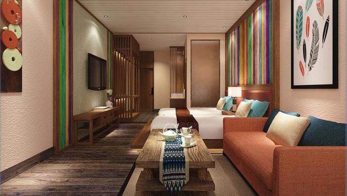 古風+現代客房的設計:此處可以感覺到濃郁的古色古風,雖然不明顯但是卻總有這樣的感覺,現代風的融入給人一種眼前一亮的感覺,當客戶拖著勞累的身體進入客房之后,一杯濃郁的茶香會讓人們瞬間感覺精神起來,靜靜的坐下來品一杯茶水,一身的疲憊盡皆消去。