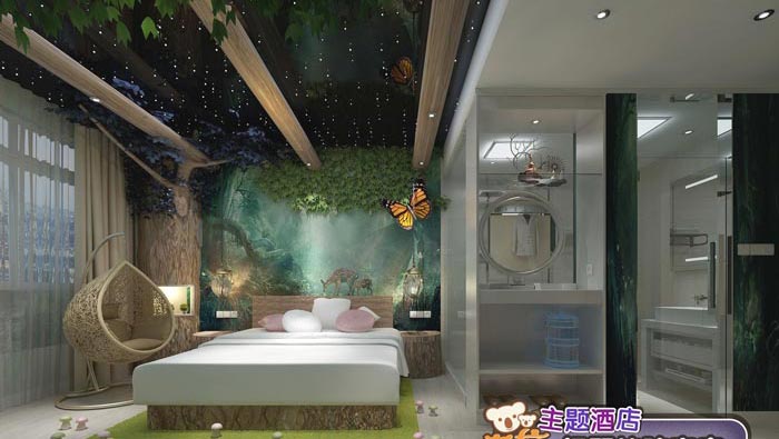 綠野仙蹤客房的設計:綠野仙蹤講述了美國堪薩斯州小姑娘,多蘿西被龍卷風帶入魔幻世界,在“奧茲國”經歷了一系列冒險后最終安然回家的故事,設計師希望給客戶一場特殊的、奇妙的探險旅行,讓客戶在旅行中增長見識,培養內涵,得到了智慧與勇氣。