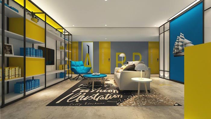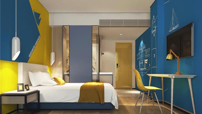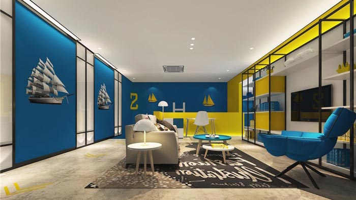 雙人間的設計:空間以藍黃兩色為主,就是希望打造一個簡約、時尚的住宿空間,仿木紋的地板、玻璃隔斷以及由花磚拼接而成的墻面裝飾,種種設計都是為了給客戶營造一種強烈的層次感和時尚感,其中藍色海洋與帆船,寓意著如家一般的溫馨港灣。