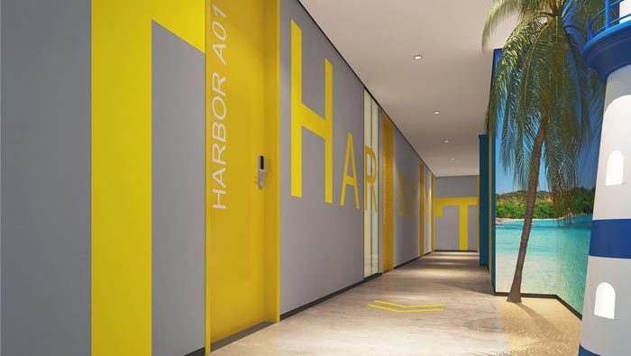 過道的設計:引導線加上燈塔為我們指引了方向,讓我們更加具象的了解燈塔的作用,同時風景宜人的墻畫讓我們仿佛置身于海島之中,讓客戶在此處可以感受到海洋的魅力,讓大家對于海洋有更多的憧憬,客戶所需正是酒店所求,這也是此次設計的目標,讓更多的人了解自己、認識自己,以此去尋找那屬于自己的心靈港灣。