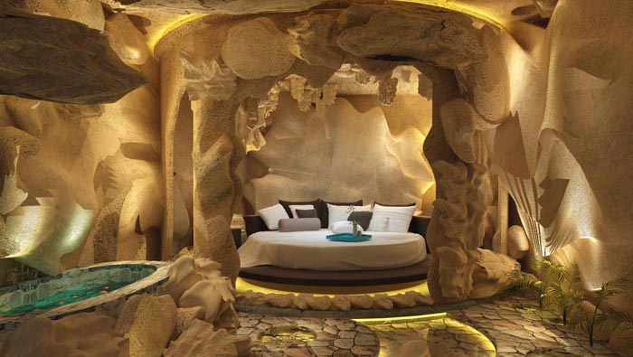 spa客房的設(shè)計:此處要是不知道還真以為是在山洞當(dāng)中的酒店,在設(shè)計師看來人們現(xiàn)在需要的是一個安寧之所,此處給人的第一感覺就是心曠神怡,其中冬暖夏涼也繼承了山洞的屬性,設(shè)計師這樣做就是做到百分百相似,讓人在城市中可以體會到自然的神奇。