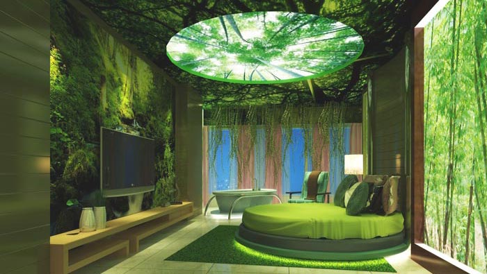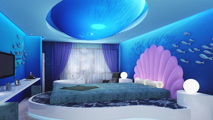 海底客房的設(shè)計:對于海底相信每一個人都充滿了好奇,設(shè)計師也不例外,故此此地是設(shè)計師為了滿足大家的好奇之心而特意設(shè)計的,頭頂月光投影在海面之上,我們躺在床上仿佛置身于海底,魚群從我們身邊游過,讓我們的思緒與魚群一起擺動,感受那不曾感受過的神奇。
