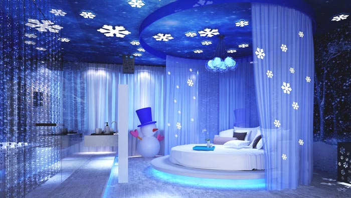 瑞雪客房的設(shè)計:正所謂瑞雪兆豐年,這是古代先賢總結(jié)的自然規(guī)則,其中包括了雪的重要性,我們躺在床上雪花隨風(fēng)飄揚而下,讓我們仿佛置身在大雪紛飛之中,一旁雪人為我們站崗放哨,此處不管是夏季還是冬季,對于客戶來說都是一個不錯的場所,讓我們在此地見證大自然的神奇與美麗。